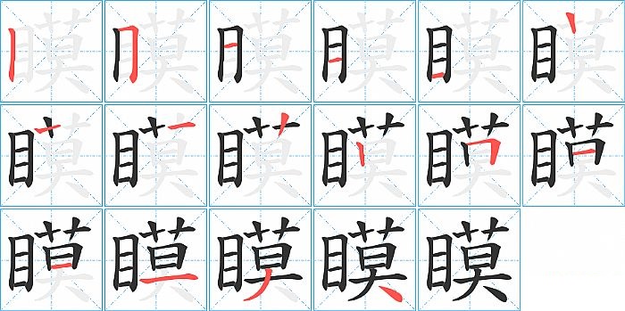 瞙是左右结构,瞙的部首是“目”,部外笔画10画,总笔画15画,瞙的笔画顺序是“竖、横折、横、横、横、横、竖、竖、竖、横折、横、横、横、撇、捺”。看看“瞙”字什么意思 >>