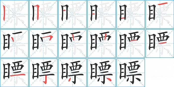 瞟是左右结构,瞟的部首是“目”,部外笔画11画,总笔画16画,瞟的笔画顺序是“竖、横折、横、横、横、横、竖、横折、竖、竖、横、横、横、竖钩、撇、点”。看看“瞟”字什么意思 >>