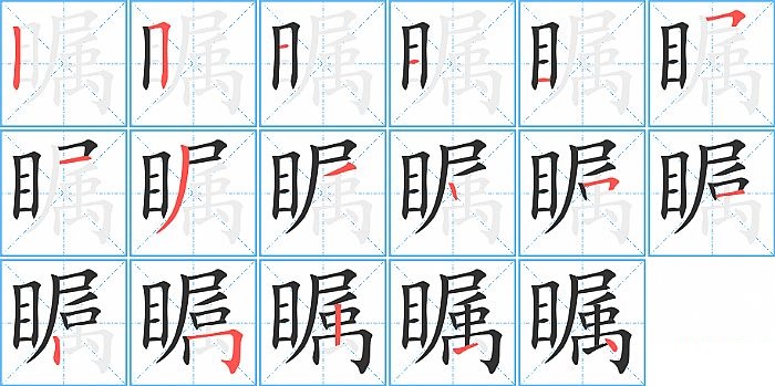 瞩是左右结构,瞩的部首是“目”,部外笔画12画,总笔画17画,瞩的笔画顺序是“竖、横折、横、横、横、横折、横、撇、撇、竖、横折、横、竖、横折钩、竖、提、点”。看看“瞩”字什么意思 >>
