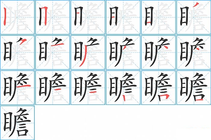 瞻是左右结构,瞻的部首是“目”,部外笔画13画,总笔画18画,瞻的笔画顺序是“竖、横折、横、横、横、撇、横撇/横钩、横、撇、撇、点、点、横、横、横、竖、横折、横”。看看“瞻”字什么意思 >>