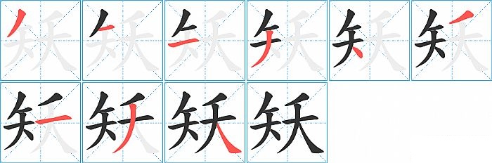 矨是左右结构,矨的部首是“矢”,部外笔画4画,总笔画9画,矨的笔画顺序是“撇、横、横、撇、点、撇、横、撇、捺”。