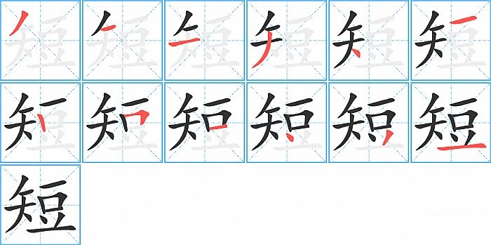 短是左右结构,短的部首是“矢”,部外笔画7画,总笔画12画,短的笔画顺序是“撇、横、横、撇、点、横、竖、横折、横、点、撇、横”。看看“短”字什么意思 >>