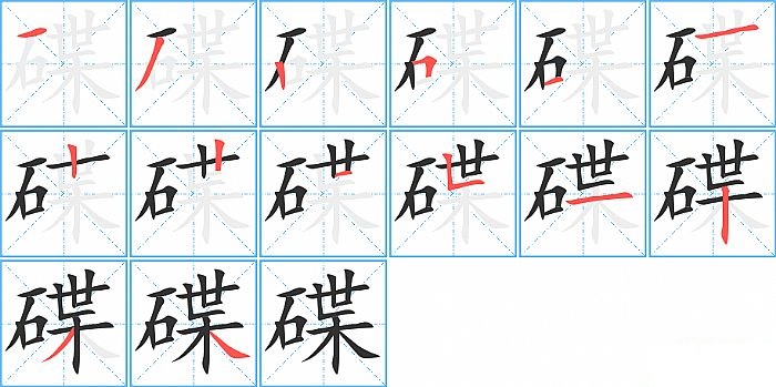 碟是左右结构;先左后右,碟的部首是“石”,部外笔画9画,总笔画14画,碟的笔画顺序是“横、撇、竖、横折、横、横、竖、竖、横、竖折/竖弯、横、竖、撇、捺”。看看“碟”字什么意思 >>