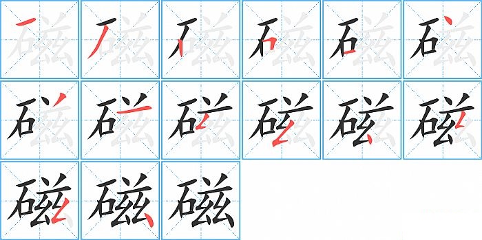 磁是左右结构,磁的部首是“石”,部外笔画9画,总笔画14画,磁的笔画顺序是“横、撇、竖、横折、横、点、撇、横、撇折、撇折、点、撇折、撇折、点”。看看“磁”字什么意思 >>