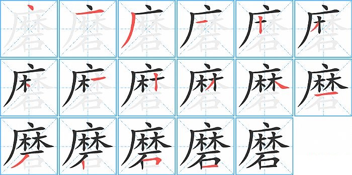 磨是半包围结构,磨的部首是“石”,部外笔画11画,总笔画16画,磨的笔画顺序是“点、横、撇、横、竖、撇、点、横、竖、撇、捺、横、撇、竖、横折、横”。看看“磨”字什么意思 >>