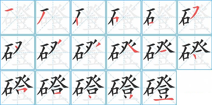磴是左右结构,磴的部首是“石”,部外笔画12画,总笔画17画,磴的笔画顺序是“横、撇、竖、横折、横、横撇/横钩、点、撇、撇、捺、横、竖、横折、横、点、撇、横”。看看“磴”字什么意思 >>