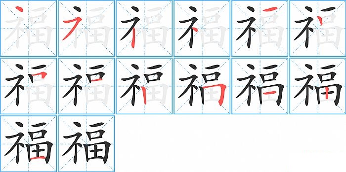 福是左右结构,福的部首是“礻”,部外笔画9画,总笔画13画,福的笔画顺序是“点、横撇/横钩、竖、点、横、竖、横折、横、竖、横折、横、竖、横”。看看“福”字什么意思 >>