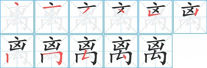 离是上下结构,离的部首是“亠”,部外笔画8画,总笔画10画,离的笔画顺序是“点、横、撇、点、竖折/竖弯、竖、竖、横折钩、撇折、点”。看看“离”字什么意思 >>