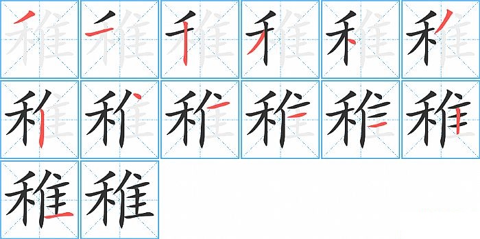 稚是左右结构,稚的部首是“禾”,部外笔画8画,总笔画13画,稚的笔画顺序是“撇、横、竖、撇、点、撇、竖、点、横、横、横、竖、横”。看看“稚”字什么意思 >>
