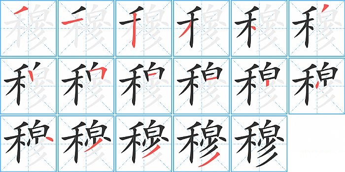 穆是左右结构,穆的部首是“禾”,部外笔画11画,总笔画16画,穆的笔画顺序是“撇、横、竖、撇、点、撇、竖、横折、横、横、竖、撇、点、撇、撇、撇”。看看“穆”字什么意思 >>