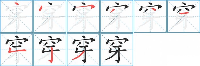 穿是上下结构,穿的部首是“穴”,部外笔画4画,总笔画9画,穿的笔画顺序是“点、点、横撇/横钩、撇、点、横、撇折、竖钩、撇”。看看“穿”字什么意思 >>
