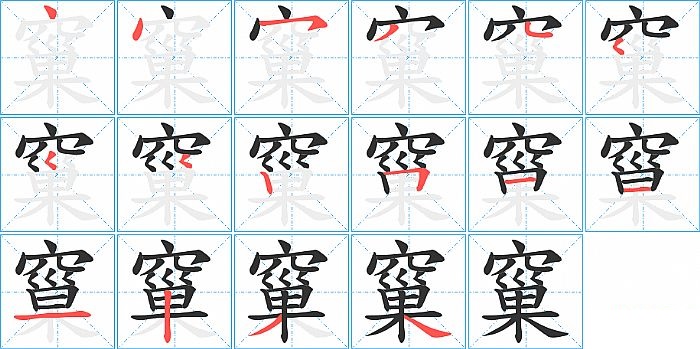 窼是上下结构,窼的部首是“穴”,部外笔画11画,总笔画16画,窼的笔画顺序是“点、点、横撇/横钩、撇、点、撇点、撇点、撇点、竖、横折、横、横、横、竖、撇、捺”。看看“窼”字什么意思 >>