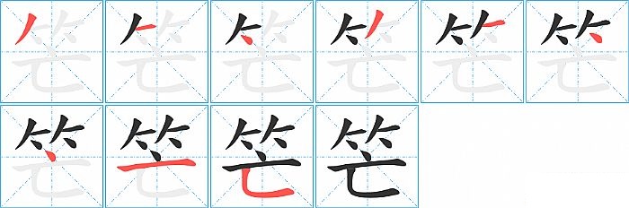 笀是上下结构,笀的部首是“竹”,部外笔画3画,总笔画9画,笀的笔画顺序是“撇、横、点、撇、横、点、点、横、竖折/竖弯”。