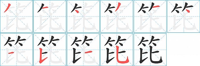 笓是上下结构,笓的部首是“竹”,部外笔画4画,总笔画10画,笓的笔画顺序是“撇、横、点、撇、横、点、横、竖提、撇、竖弯钩”。看看“笓”字什么意思 >>
