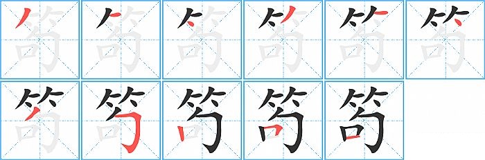 笱是上下结构,笱的部首是“竹”,部外笔画5画,总笔画11画,笱的笔画顺序是“撇、横、点、撇、横、点、撇、横折钩、竖、横折、横”。看看“笱”字什么意思 >>