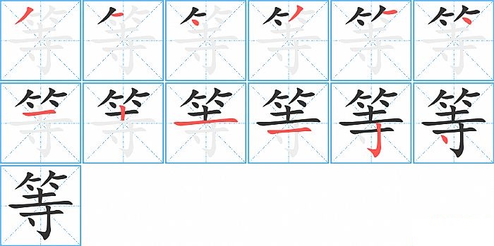 等是上下结构,等的部首是“竹”,部外笔画6画,总笔画12画,等的笔画顺序是“撇、横、点、撇、横、点、横、竖、横、横、竖钩、点”。看看“等”字什么意思 >>