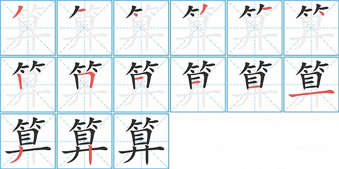 算是上下结构,算的部首是“竹”,部外笔画8画,总笔画14画,算的笔画顺序是“撇、横、点、撇、横、点、竖、横折、横、横、横、横、撇、竖”。看看“算”字什么意思 >>