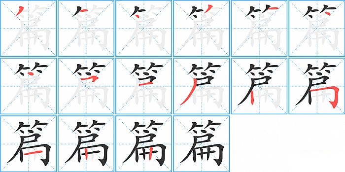 篇是上下结构,篇的部首是“竹”,部外笔画9画,总笔画15画,篇的笔画顺序是“撇、横、点、撇、横、点、点、横折、横、撇、竖、横折钩、横、竖、竖”。看看“篇”字什么意思 >>
