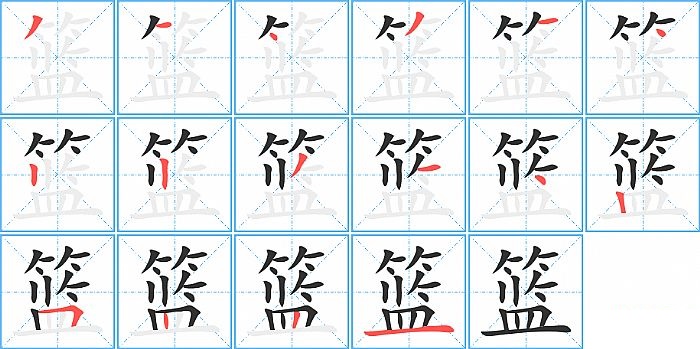 篮是上下结构,篮的部首是“竹”,部外笔画10画,总笔画16画,篮的笔画顺序是“撇、横、点、撇、横、点、竖、竖、撇、横、点、竖、横折、竖、竖、横”。看看“篮”字什么意思 >>