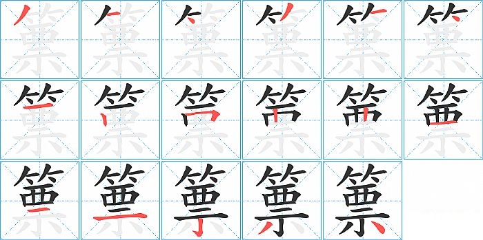 篻是上下结构,篻的部首是“竹”,部外笔画11画,总笔画17画,篻的笔画顺序是“撇、横、点、撇、横、点、横、竖、横折、竖、竖、横、横、横、竖钩、撇、点”。看看“篻”字什么意思 >>