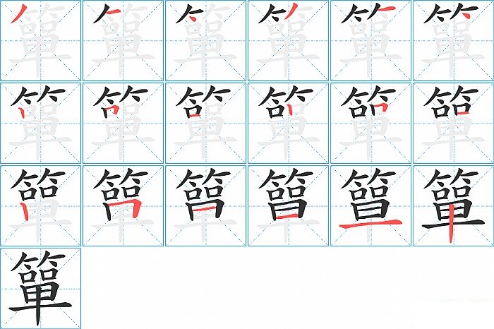 簞是上下结构,簞的部首是“竹”,部外笔画12画,总笔画18画,簞的笔画顺序是“撇、横、点、撇、横、点、竖、横折、横、竖、横折、横、竖、横折、横、横、横、竖”。看看“簞”字什么意思 >>