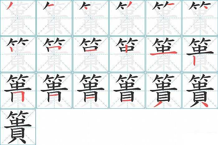 簣是上下结构,簣的部首是“竹”,部外笔画12画,总笔画18画,簣的笔画顺序是“撇、横、点、撇、横、点、竖、横折、横、竖、横、竖、横折、横、横、横、撇、点”。看看“簣”字什么意思 >>