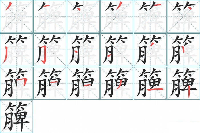 簲是上下结构,簲的部首是“竹”,部外笔画12画,总笔画18画,簲的笔画顺序是“撇、横、点、撇、横、点、撇、横折钩、横、横、撇、竖、横折、横、横、撇、横、竖”。看看“簲”字什么意思 >>