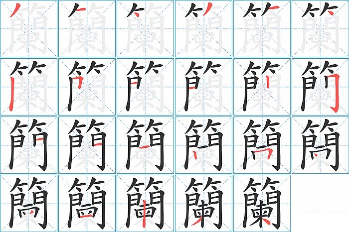 籣是上下结构,籣的部首是“竹”,部外笔画17画,总笔画23画,籣的笔画顺序是“撇、横、点、撇、横、点、横折、横、横、竖、竖、横折钩、横、横、横、竖、横折、点、撇、横、竖、撇、点”。看看“籣”字什么意思 >>
