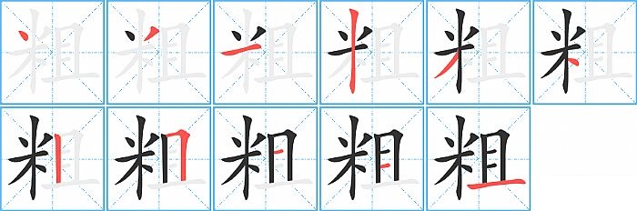 粗是左右结构,粗的部首是“米”,部外笔画5画,总笔画11画,粗的笔画顺序是“点、撇、横、竖、撇、点、竖、横折、横、横、横”。看看“粗”字什么意思 >>