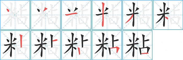 粘是左右结构,粘的部首是“米”,部外笔画5画,总笔画11画,粘的笔画顺序是“点、撇、横、竖、撇、点、竖、横、竖、横折、横”。看看“粘”字什么意思 >>