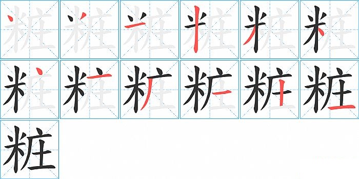 粧是左右结构,粧的部首是“米”,部外笔画6画,总笔画12画,粧的笔画顺序是“点、撇、横、竖、撇、点、点、横、撇、横、竖、横”。看看“粧”字什么意思 >>