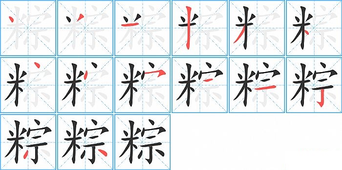 粽是左右结构,粽的部首是“米”,部外笔画8画,总笔画14画,粽的笔画顺序是“点、撇、横、竖、撇、点、点、点、横撇/横钩、横、横、竖钩、撇、点”。看看“粽”字什么意思 >>