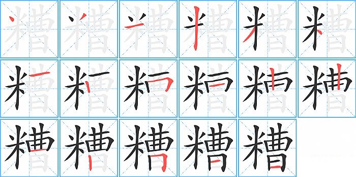 糟是左右结构,糟的部首是“米”,部外笔画11画,总笔画17画,糟的笔画顺序是“点、撇、横、竖、撇、点、横、竖、横折、横、竖、竖、横、竖、横折、横、横”。看看“糟”字什么意思 >>
