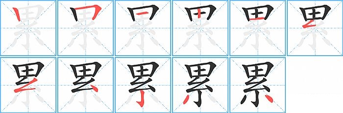 累是上下结构,累的部首是“糸”,部外笔画5画,总笔画11画,累的笔画顺序是“竖、横折、横、竖、横、撇折、撇折、点、竖钩、撇、点”。看看“累”字什么意思 >>