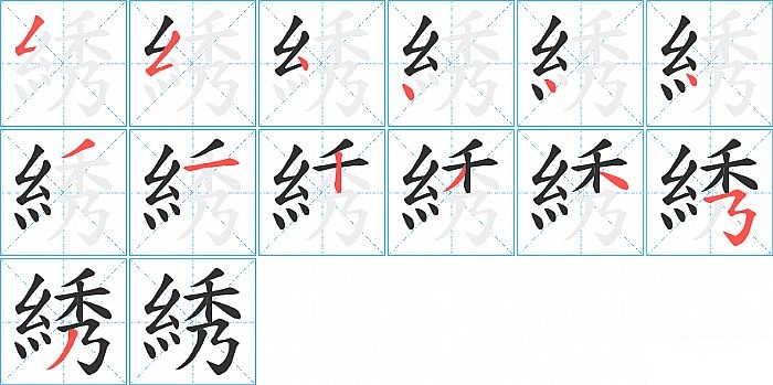 綉是左右结构,綉的部首是“糹”,部外笔画7画,总笔画13画,綉的笔画顺序是“撇折、撇折、点、点、点、点、撇、横、竖、撇、捺、横折折折钩/横撇弯钩、撇”。看看“綉”字什么意思 >>