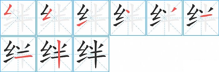 绊是左右结构,绊的部首是“纟”,部外笔画5画,总笔画8画,绊的笔画顺序是“撇折、撇折、提、点、撇、横、横、竖”。