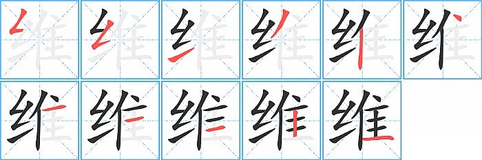 维是左右结构,维的部首是“纟”,部外笔画8画,总笔画11画,维的笔画顺序是“撇折、撇折、提、撇、竖、点、横、横、横、竖、横”。看看“维”字什么意思 >>