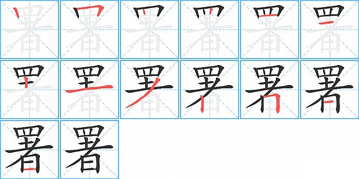 署是上下结构,署的部首是“罒”,部外笔画8画,总笔画13画,署的笔画顺序是“竖、横折、竖、竖、横、横、竖、横、撇、竖、横折、横、横”。看看“署”字什么意思 >>