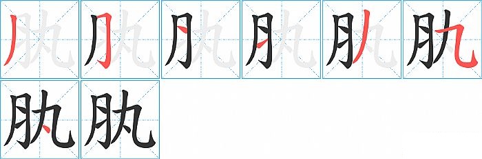 肒是左右结构,肒的部首是“月”,部外笔画3画,总笔画7画,肒的笔画顺序是“撇、横折钩、横、横、撇、横折弯钩/横斜钩、点”。