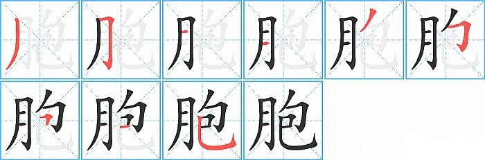 胞是左右结构,胞的部首是“月”,部外笔画5画,总笔画9画,胞的笔画顺序是“撇、横折钩、横、横、撇、横折钩、横折、横、竖弯钩”。看看“胞”字什么意思 >>