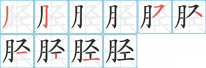 胫是左右结构,胫的部首是“月”,部外笔画5画,总笔画9画,胫的笔画顺序是“撇、横折钩、横、横、横撇/横钩、点、横、竖、横”。看看“胫”字什么意思 >>