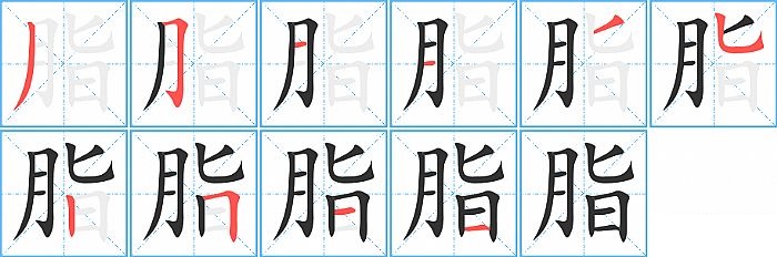 脂是左右结构,脂的部首是“月”,部外笔画6画,总笔画10画,脂的笔画顺序是“撇、横折钩、横、横、撇、竖弯钩、竖、横折、横、横”。看看“脂”字什么意思 >>