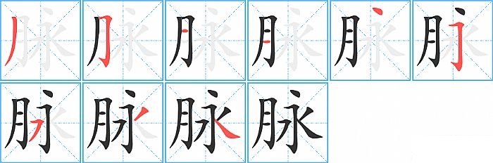 脉是左右结构,脉的部首是“月”,部外笔画5画,总笔画9画,脉的笔画顺序是“撇、横折钩、横、横、点、横折钩、横撇/横钩、撇、捺”。看看“脉”字什么意思 >>