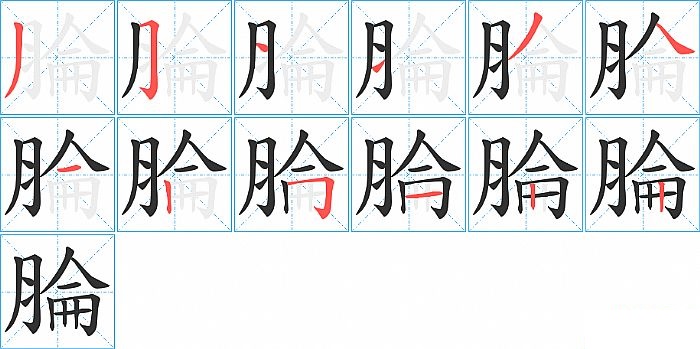 腀是左右结构,腀的部首是“月”,部外笔画8画,总笔画12画,腀的笔画顺序是“撇、横折钩、横、横、撇、捺、横、竖、横折钩、横、竖、竖”。看看“腀”字什么意思 >>
