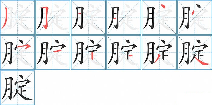 腚是左右结构,腚的部首是“月”,部外笔画8画,总笔画12画,腚的笔画顺序是“撇、横折钩、横、横、点、点、横撇/横钩、横、竖、横、撇、捺”。看看“腚”字什么意思 >>