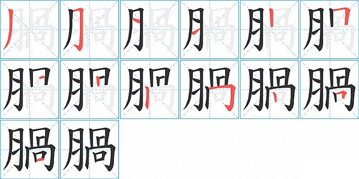 腡是左右结构,腡的部首是“月”,部外笔画8画,总笔画12画,腡的笔画顺序是“撇、横折钩、横、横、竖、横折、横折、竖、横折钩、竖、横折、横”。看看“腡”字什么意思 >>