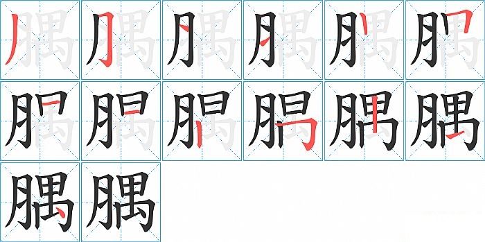 腢是左右结构,腢的部首是“月”,部外笔画9画,总笔画13画,腢的笔画顺序是“撇、横折钩、横、横、竖、横折、横、横、竖、横折钩、竖、提、点”。看看“腢”字什么意思 >>