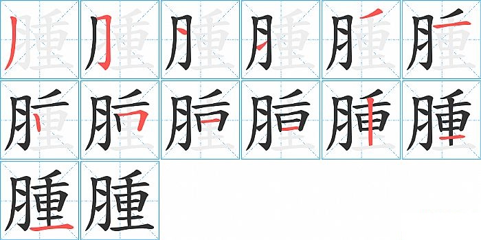 腫是左右结构,腫的部首是“月”,部外笔画9画,总笔画13画,腫的笔画顺序是“撇、横折钩、横、横、撇、横、竖、横折、横、横、横、竖、横”。看看“腫”字什么意思 >>