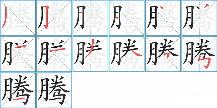 腾是左右结构,腾的部首是“月”,部外笔画9画,总笔画13画,腾的笔画顺序是“撇、横折钩、横、横、点、撇、横、横、撇、捺、横折、竖折折钩、横”。看看“腾”字什么意思 >>