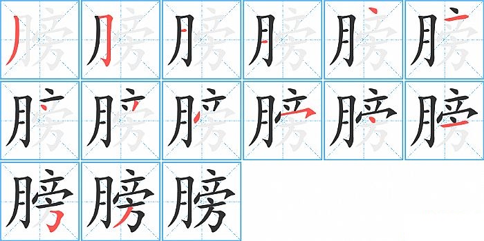 膀是左右结构,膀的部首是“月”,部外笔画10画,总笔画14画,膀的笔画顺序是“撇、横折钩、横、横、点、横、点、撇、点、横撇/横钩、点、横、横折钩、撇”。看看“膀”字什么意思 >>